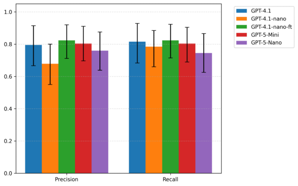 Figure 2. Precision and recall of baseline and fine-tuned models. Grouped bar plots show precision and recall for five models, including the fine-tuned GPT-4.1-nano variant. Error bars represent 95% bootstrap confidence intervals computed across all evaluation runs. The fine-tuned GPT-4.1-nano achieves higher point estimates than its baseline counterpart in this sample, but the confidence intervals show substantial overlap.