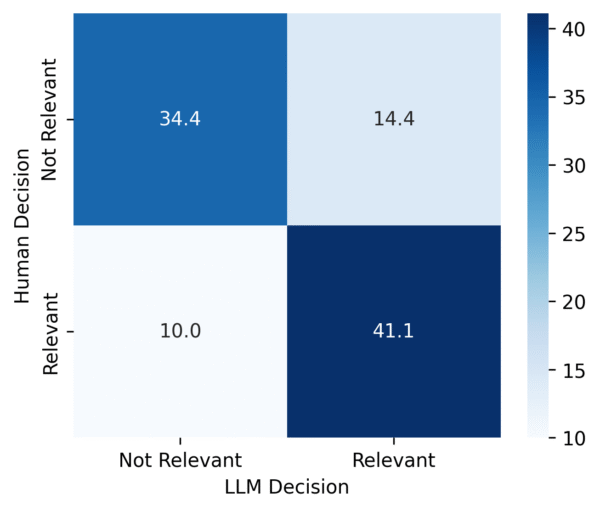 Figure 1. Confusion matrix of classifier predictions. Heatmap showing the percentage of press releases classified as relevant or not relevant by the LLM compared to human labels. The matrix summarizes how often the classifier aligned with or diverged from human judgments on the evaluation set.